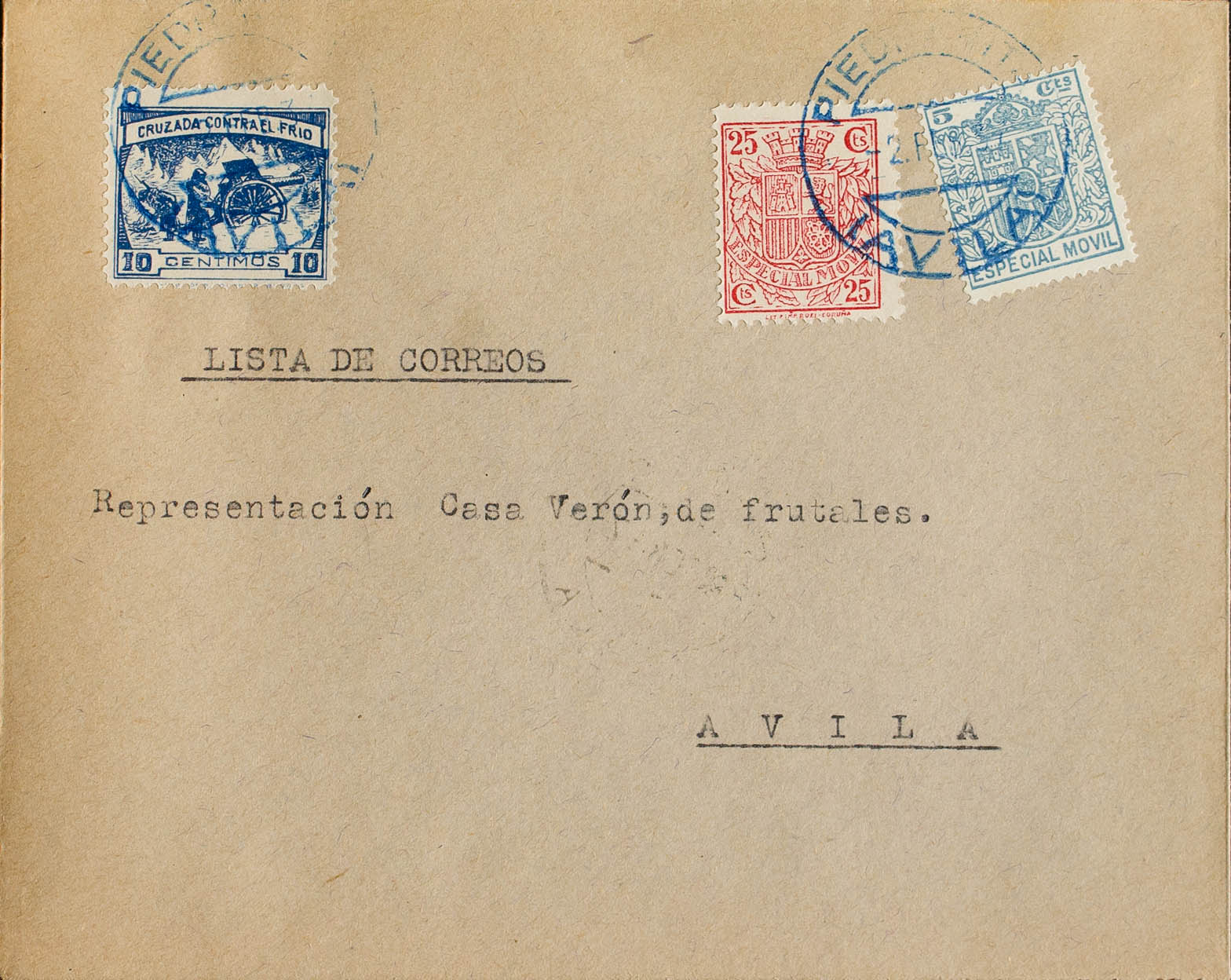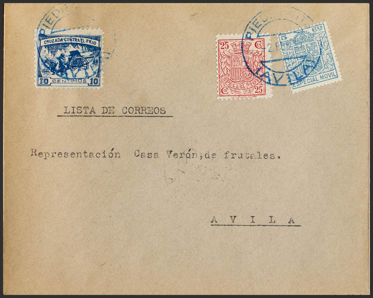 3. 1937. 10 cts azul y fiscales de 5 cts azul y 25 cts rosa carmÃn. PIEDRAHITA a AVILA. Matasello PIEDRAHITA / (AVILA), en azul y al dorso llegada. MAGNIFICA.