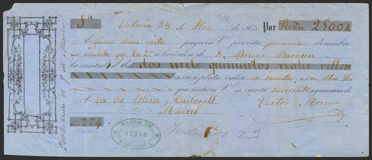 1866. 2 reales 50 cts rojo sobre amarillo, sello de GIRO sobre Letra de Cambio fechada en Vitoria girada a favor del Señor Barreo de Zaragoza por 2.500 reales de vellón. MAGNIFICA.