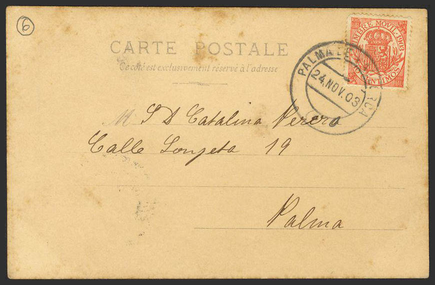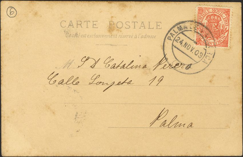 23. 1903. 10 cts naranja, timbre móvil. Tarjeta correo interior de PALMA. Matasello PALMA DE MALLORCA / 7. MAGNIFICA Y MUY RARO USO DE UN SELLO DE TIMBRE MOVIL PARA USO POSTAL.