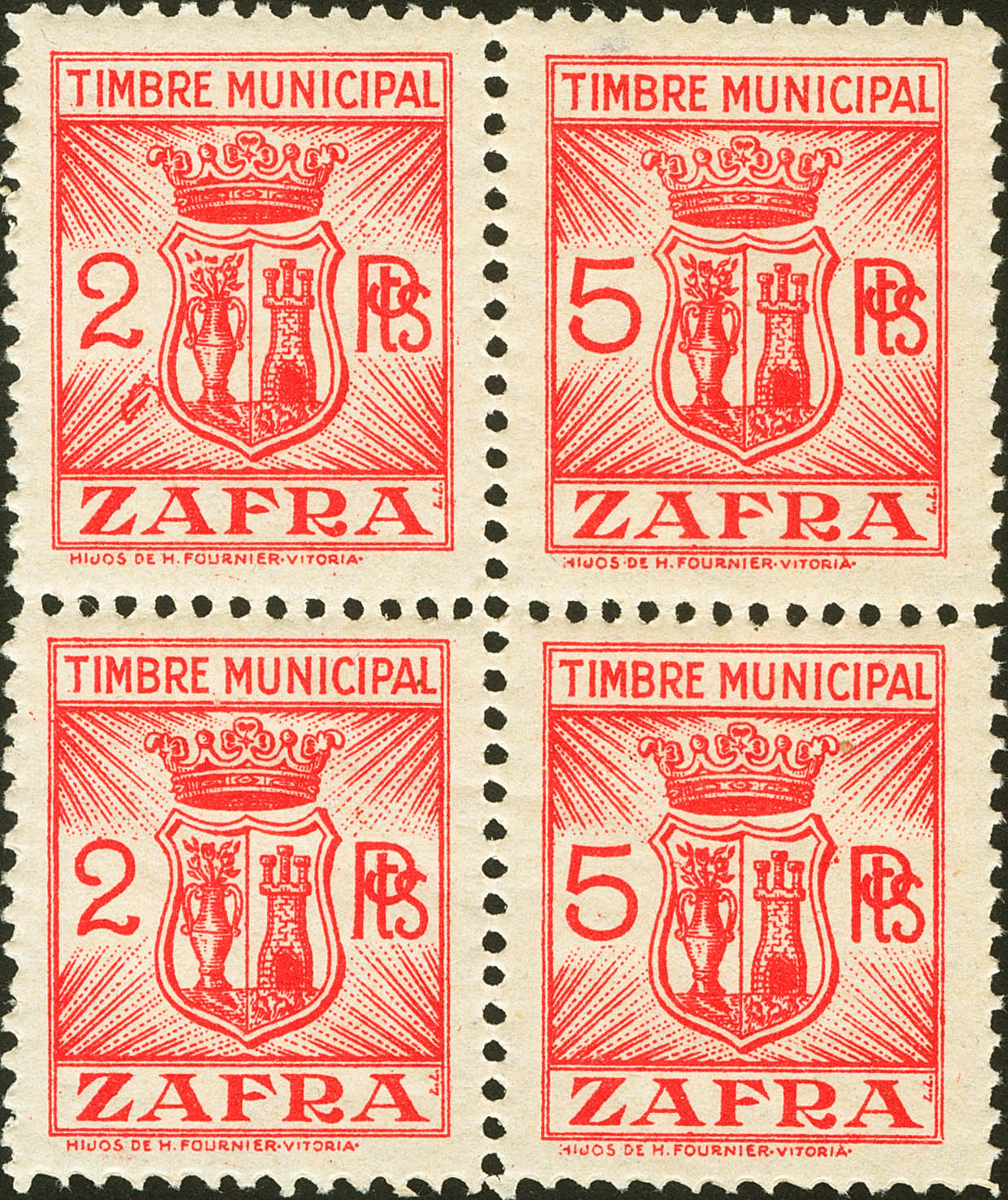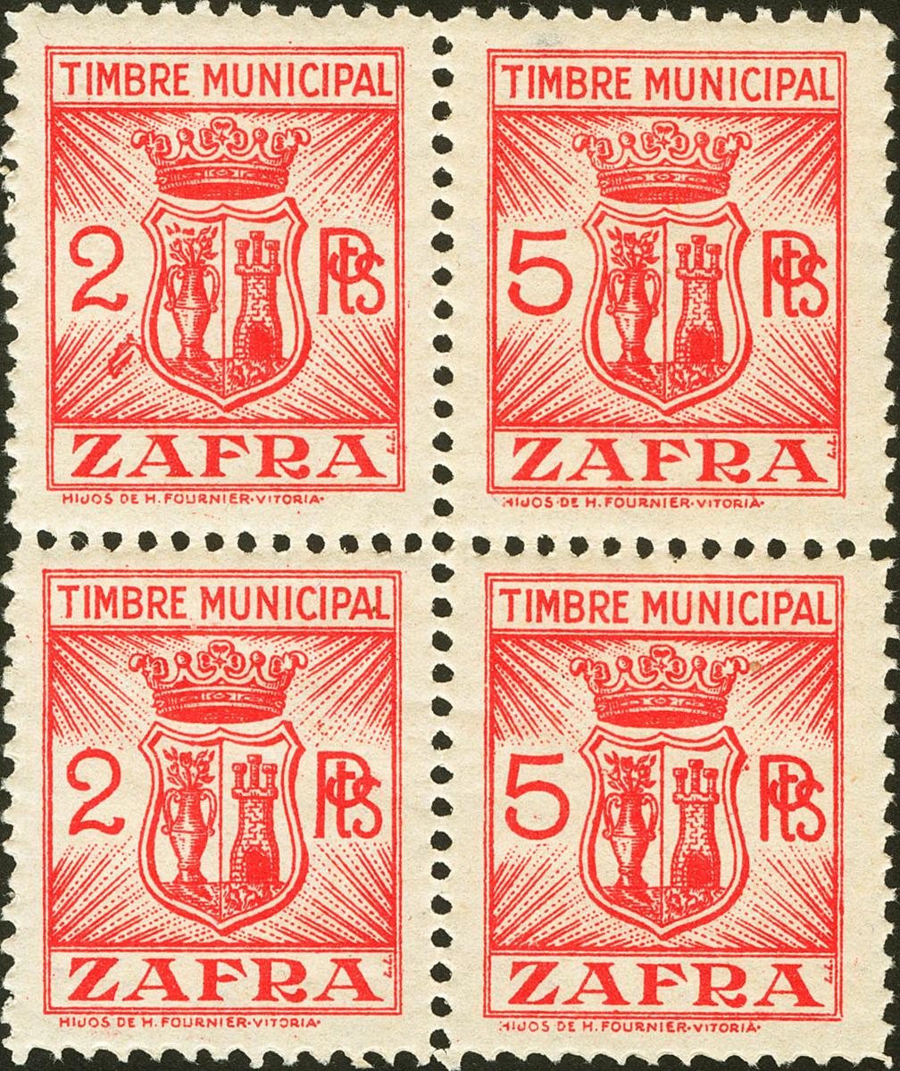 ★★(1939ca). 2 pts rojo, dos sellos y 5 pts rojo, dos sellos, unidos en un bloque de cuatro. TIMBRE MUNICIPAL-ZAFRA (BADAJOZ). MAGNIFICO Y RARO EN BLOQUE.