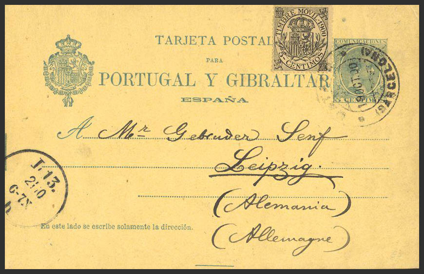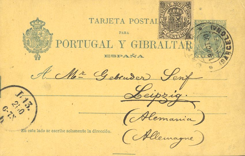 EP34, Fis. 1900. 5 cts MOVIL y 5 cts tarjeta Entero Postal de BARCELONA a ALEMANIA. MAGNIFICA Y RARISIMA.