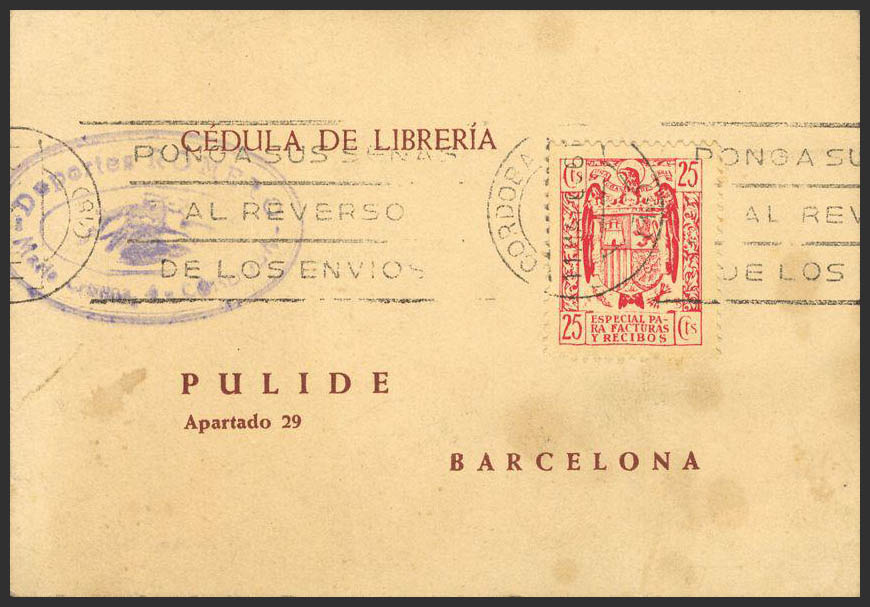 Fis 91. 1960. 25 cts FACTURAS. Tarjeta de CORDOBA a BARCELONA. MAGNIFICA Y RARA CON UN USO TAN TARDIO.