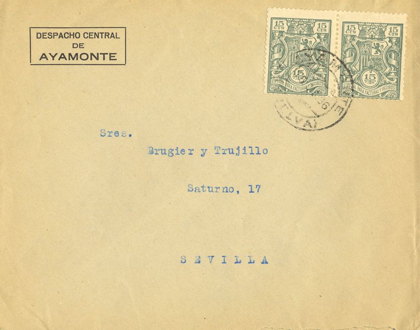 Fis 15(2). 1936. 15 cts, pareja FACTURAS. AYAMONTE a SEVILLA. Al dorso llegada. MAGNIFICA.