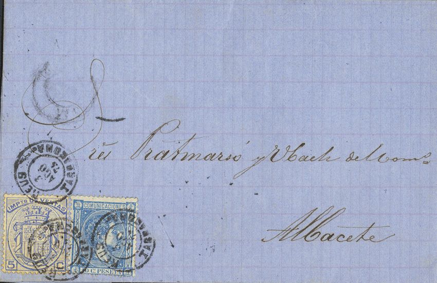164, Fis 1. 1875. 10 cts y 5 cts IMPUESTO DE VENTA. REUS a ALBACETE. MAGNIFICA Y RARO USO DE UN SELLO FISCAL PARA USO POSTAL.