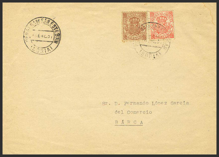 Fis 26/27. 1937. 10 cts castaño y 50 cts naranja MOVILES. PEÑALBA DE SAN ESTEBAN a BARCA (SORIA). Al dorso llegada. MAGNIFICA.