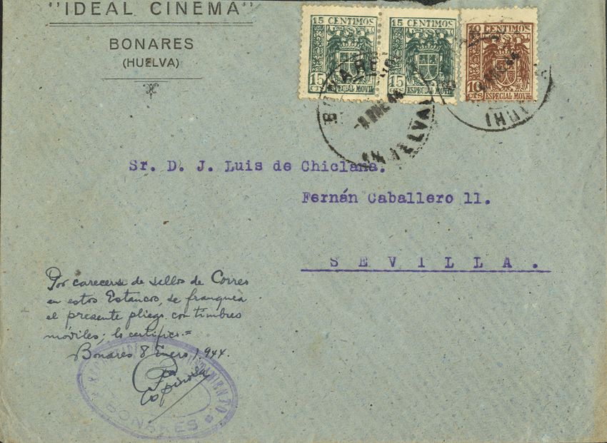1943. 15 cts castaño y 15 cts verde, pareja MOVILES. BONARES a SEVILLA. Manuscrito "Franqueada con timbres móviles por carecer de sellos de correo en el estanco". MAGNIFICA Y NO CATALOGADO.