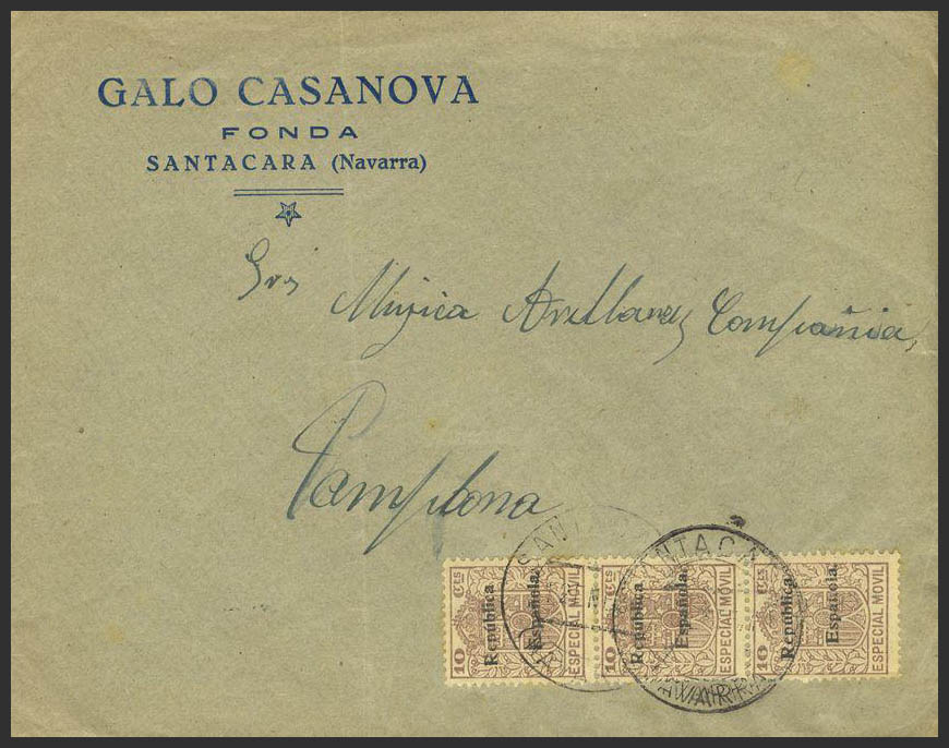 Fis 41(3). 1931. 10 cts castaño, tira vertical de tres, MOVIL. SANTACARA a PAMPLONA. MAGNIFICA.