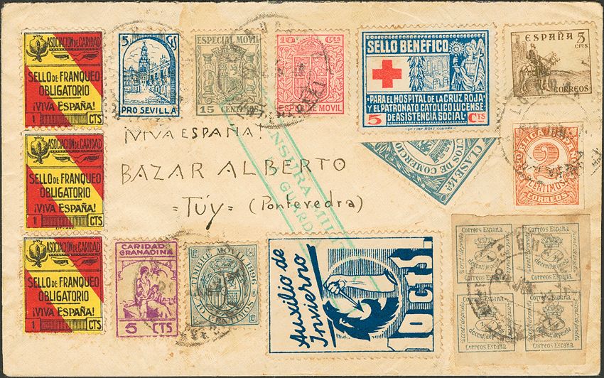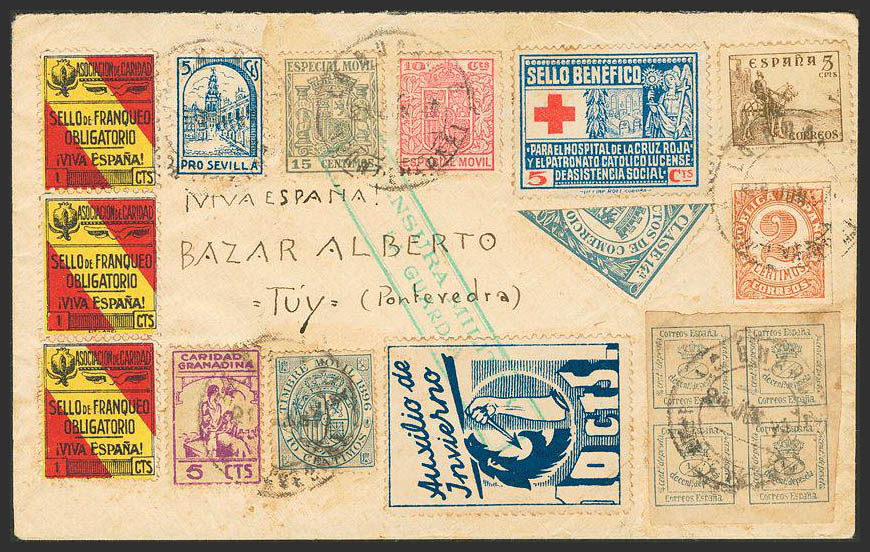 678. 1937. Diversos valores Locales, Fiscales y Benéficos. LA GUARDIA a TUY. Carta filatélica. MAGNIFICA.