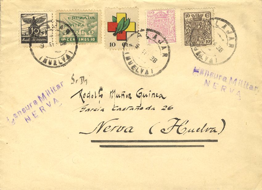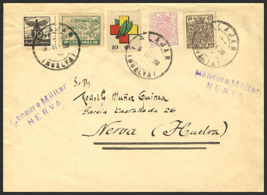 Fis 29, 32. 1938. 10 cts y 20 cts MOVILES y 10 cts, tres sellos benéficos. ALAJAR a NERVA. MAGNIFICA Y RARA.