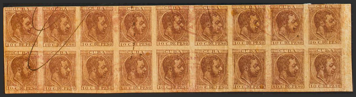 102F(18). 1883. 10 ctvos castaño, bloque de dieciocho (sin dentar). FALSO POSTAL. MAGNIFICO Y RARISIMO, POSIBLEMENTE SE TRATE DEL MAYOR BLOQUE CONOCIDO. Cert. ECHENAGUSIA.