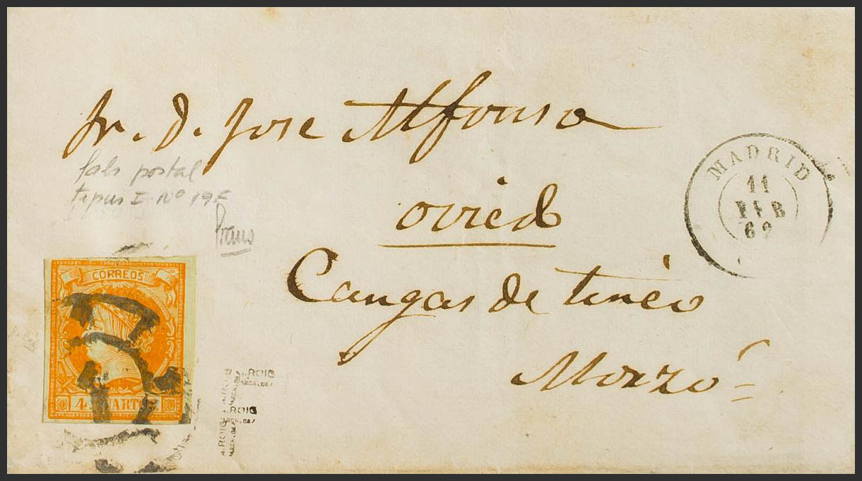 52F. 1862. 4 cuartos naranja FALSO POSTAL TIPO I. MADRID a CANGAS DE TINEO. MAGNIFICA.