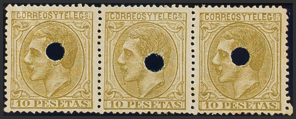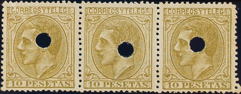 (★) 209F(3). 1879. 10 pts sepia oliva, tira de tres. FALSO POSTAL TIPO UNICO, taladrado. MAGNIFICA Y RARO EN TIRA DE TRES.