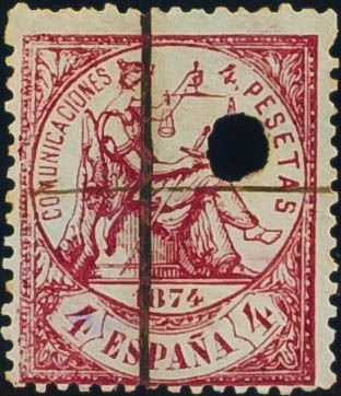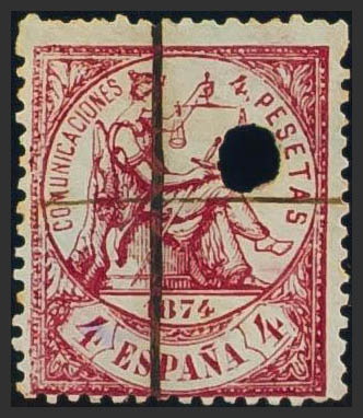 151F. 1874. 4 pts carmÃn. FALSO POSTAL TIPO II, taladrado e inutilizado a pluma. MAGNIFICO.
