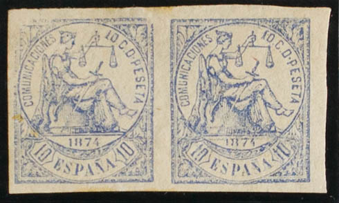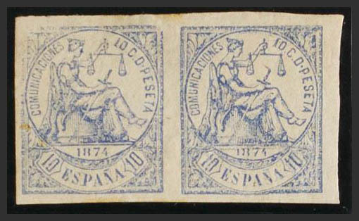 ★ 145sF(2). 1874. 10 cts ultramar, pareja FALSO POSTAL TIPO II. SIN DENTAR. MAGNIFICA.