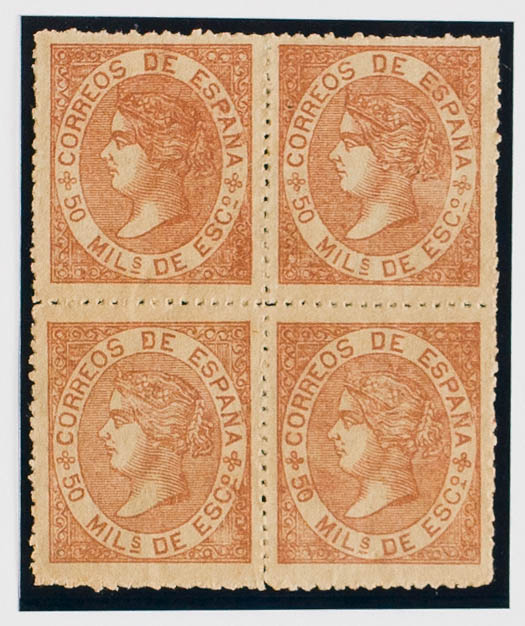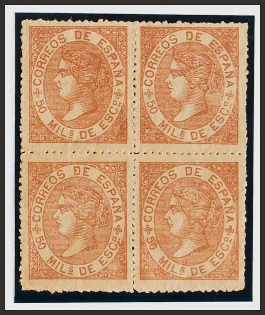 ★ 96F(4). 1867. 50 mils castaño claro, bloque de cuatro FALSO POSTAL TIPO III. MAGNIFICO Y RARISIMO BLOQUE DE CUATRO EN NUEVO.