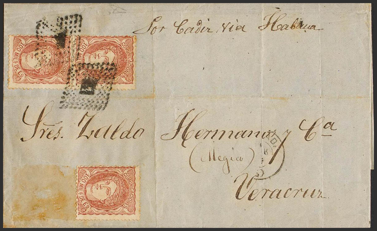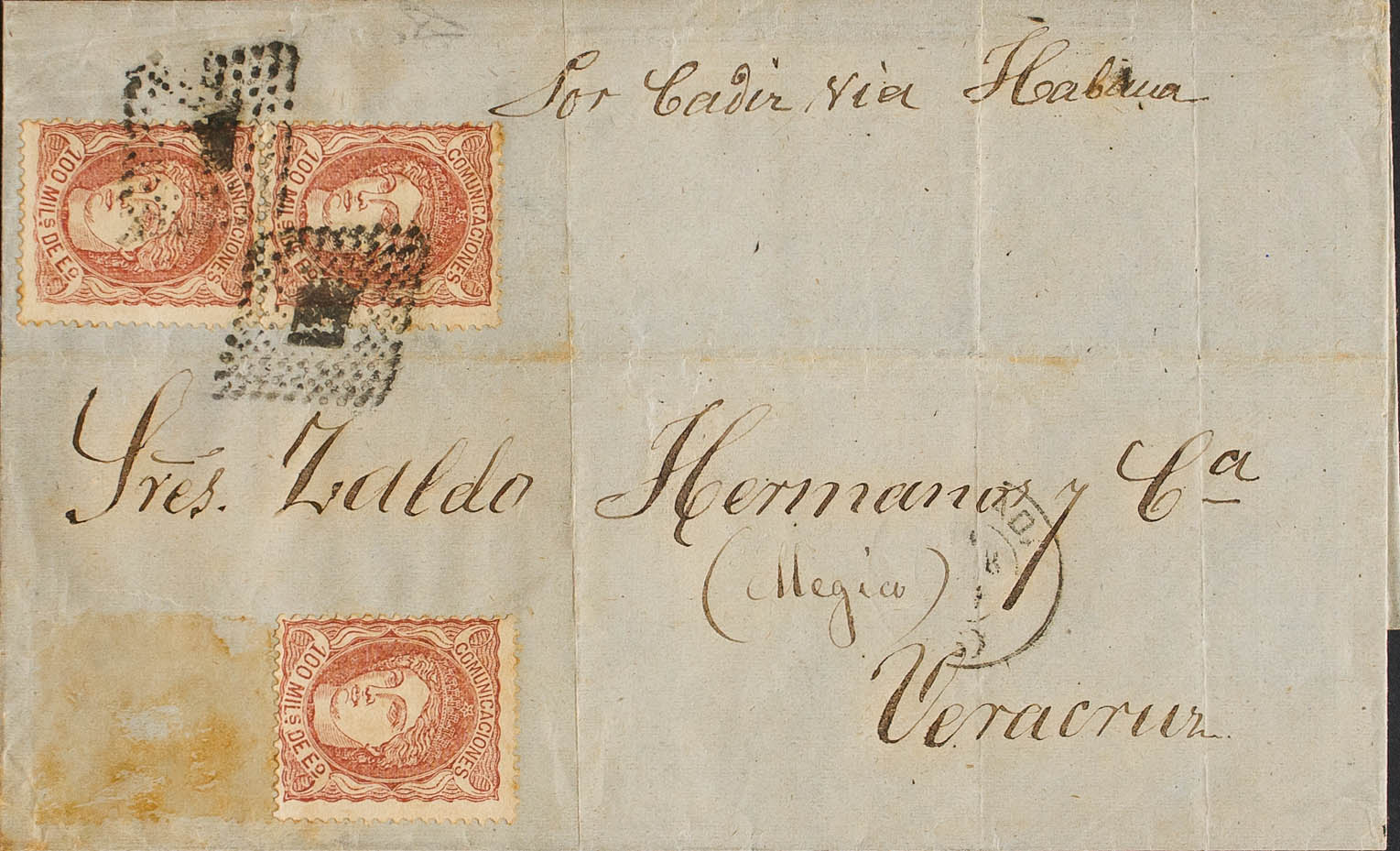 108F(3). 1872. 100 mils castaño rojo FALSO POSTAL TIPO II, tres sellos (un sello desprendido muy probablemente en origen ya que la goma no era tan eficaz como la original, sólamente inutilizados dos de los sellos). GRANADA a VERACRUZ (MEXICO). MAGNIFICA Y RARISIMO FRANQUEO CON FALSOS POSTALES A MEXICO.