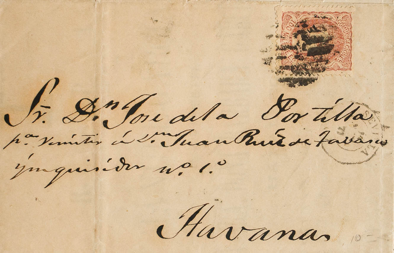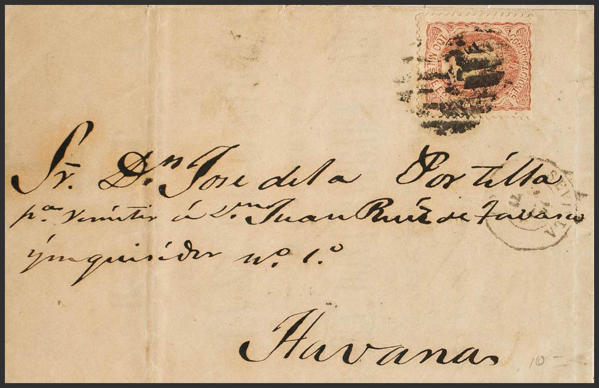 108F. 1871. 100 mils castaño rojo FALSO POSTAL TIPO II. SEVILLA a LA HAVANA. MAGNIFICA Y RARA DIRIGIDA A CUBA CON UN FALSO POSTAL.