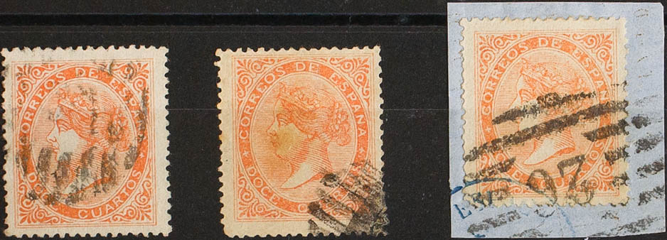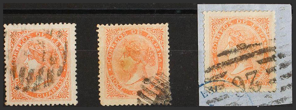 89F(3). 1867. Conjunto de tres sellos del 12 cuartos naranja FALSO POSTAL TIPO UNICO, dos con PARRILLA CON Nº2, de Barcelona y el tercero con matasello PARRILLA CON Nº26, de Gerona. MAGNIFICOS Y RAROS.