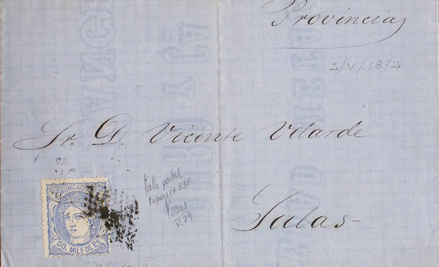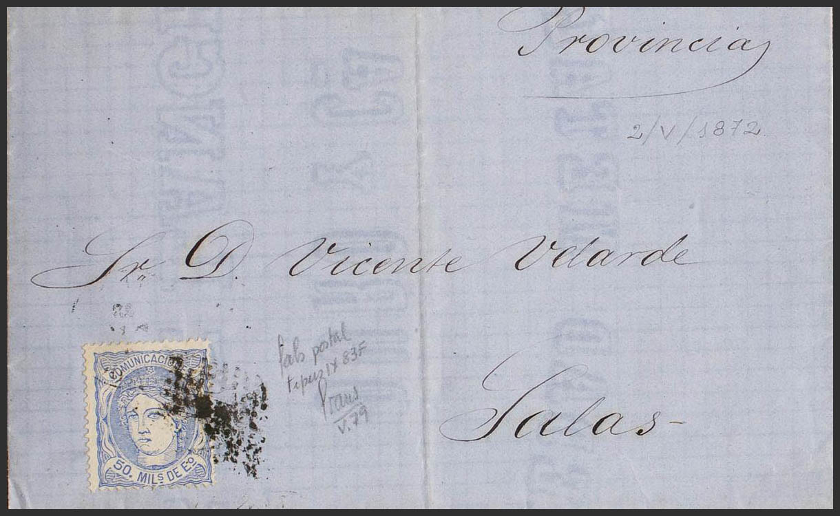 107F. 1872. 50 mils ultramar FALSO POSTAL TIPO IX. LA FELGUERA (ASTURIAS) a SALAS. MAGNIFICA E INUSUAL USADO EN LA FELGUERA, HAY QUE RECORDAR QUE ESTE TIPO DE FALSO POSTAL FUE MUY PROFUSAMENTE UTILIZADO EN TODA ESPAÑA.