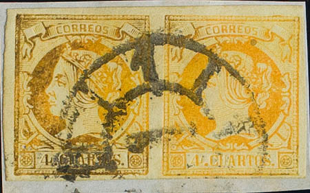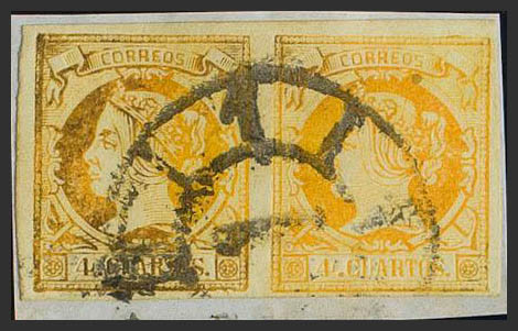 △ 52F(2). 1860. 4 cuartos naranja FALSO POSTAL TIPO XIII, en pareja y sobre fragmento. Matasello R.CARRETA Nº1, de Madrid. MAGNIFICA Y RARA.