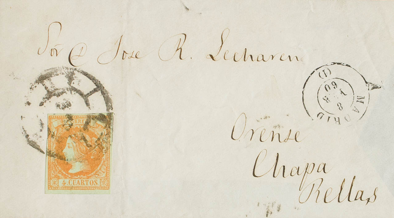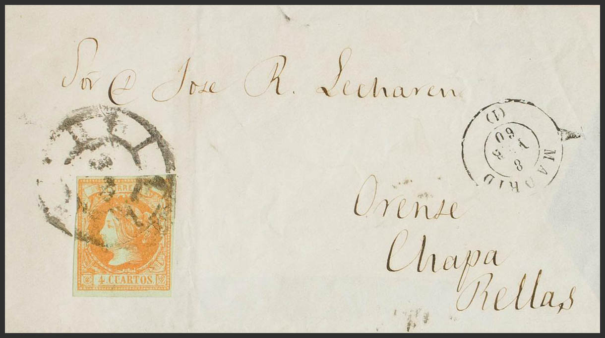 52F. 1860. 4 cuartos naranja FALSO POSTAL TIPO VIII. MADRID a RELLAS. Matasello R.CARRETA Nº1, de Madrid. MAGNIFICA Y MUY RARA.