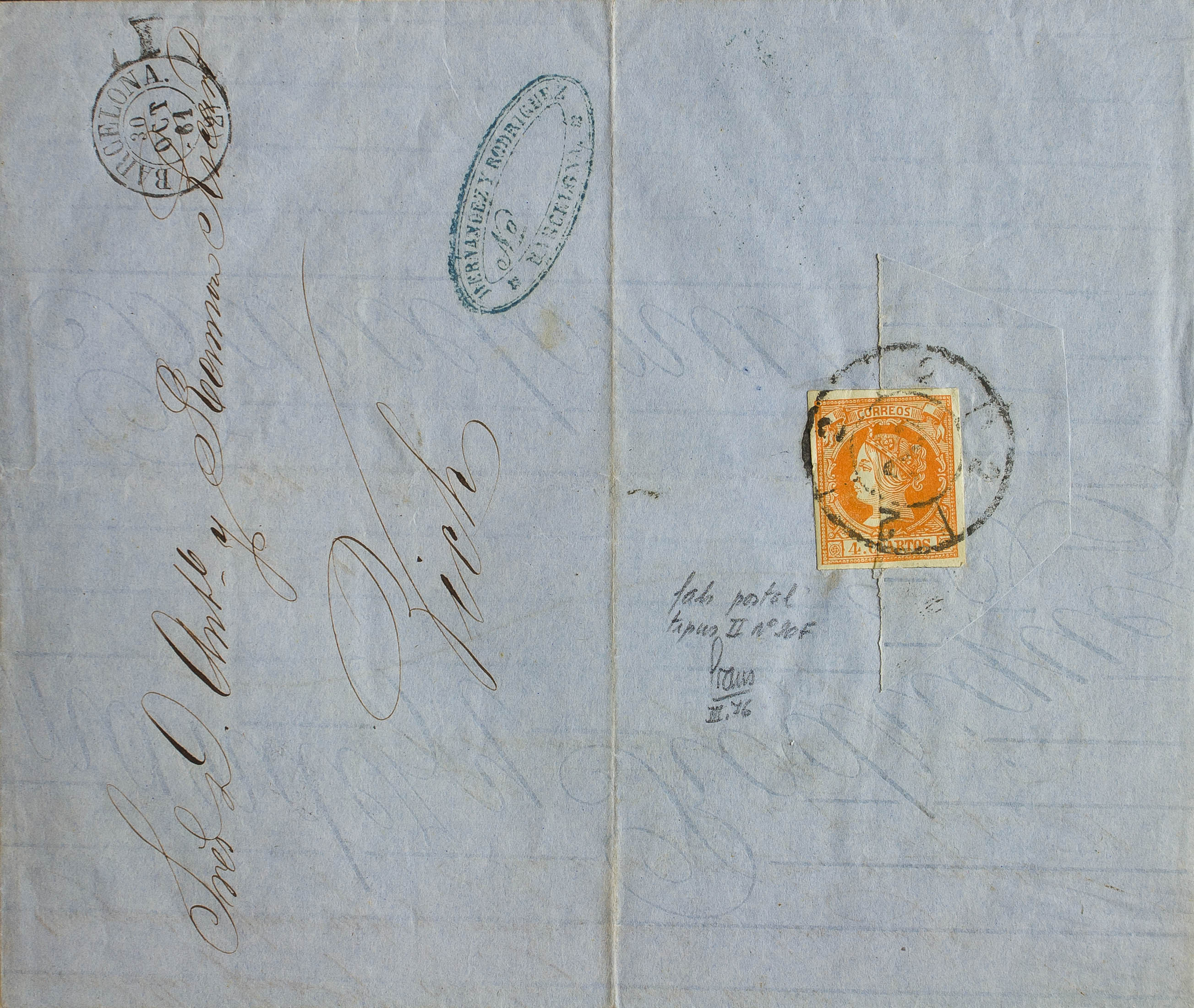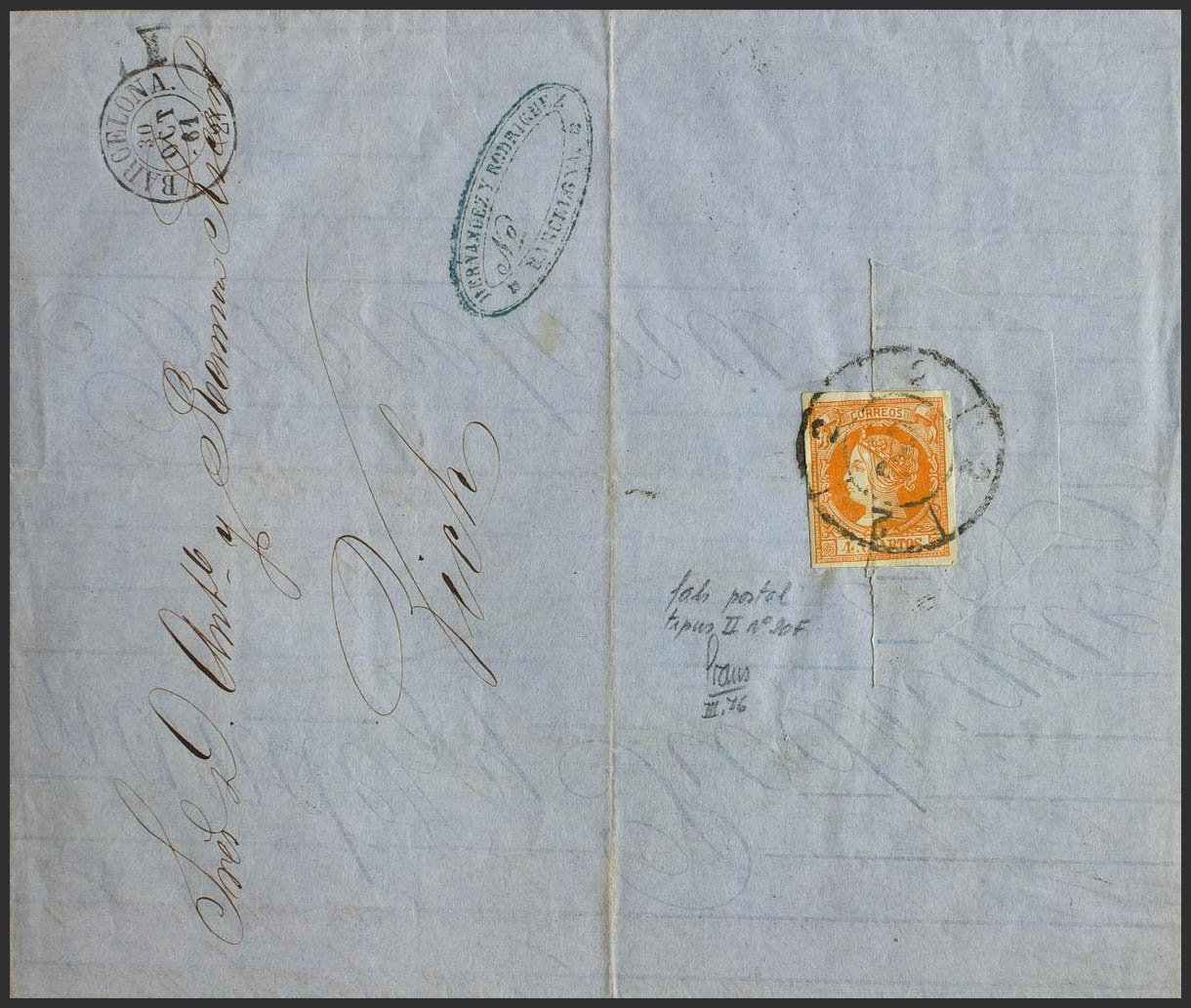 52F. 1861. 4 cuartos naranja (utilizado como cierre de la carta, en perfecto estado) FALSO POSTAL TIPO II. BARCELONA a VICH. MAGNIFICA.