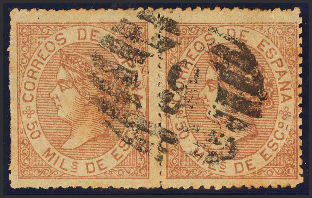 96F(2). 1867. 50 mils castaño claro FALSO POSTAL TIPO III, pareja. Matasello PARRILLA Nº6, de Málaga. MAGNIFICA Y RARA.