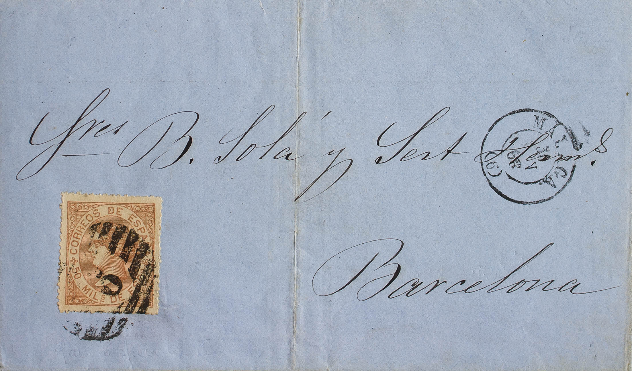 96F. 1868. 50 mils castaño claro FALSO POSTAL TIPO III. MALAGA a BARCELONA. MAGNIFICO Y RARO CIRCULADO EN CARTA.