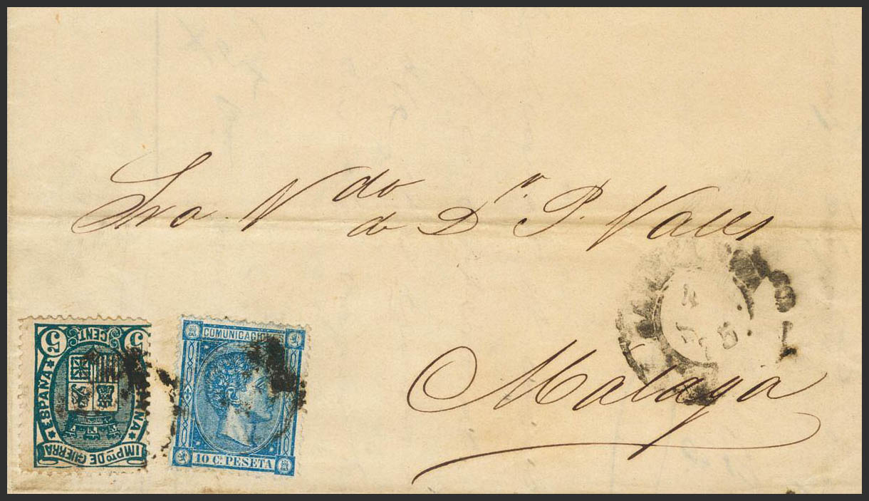 154F, 164. 1876. 5 cts verde FALSO POSTAL TIPO UNICO y 10 cts azul. BARCELONA a MALAGA. MAGNIFICA.
