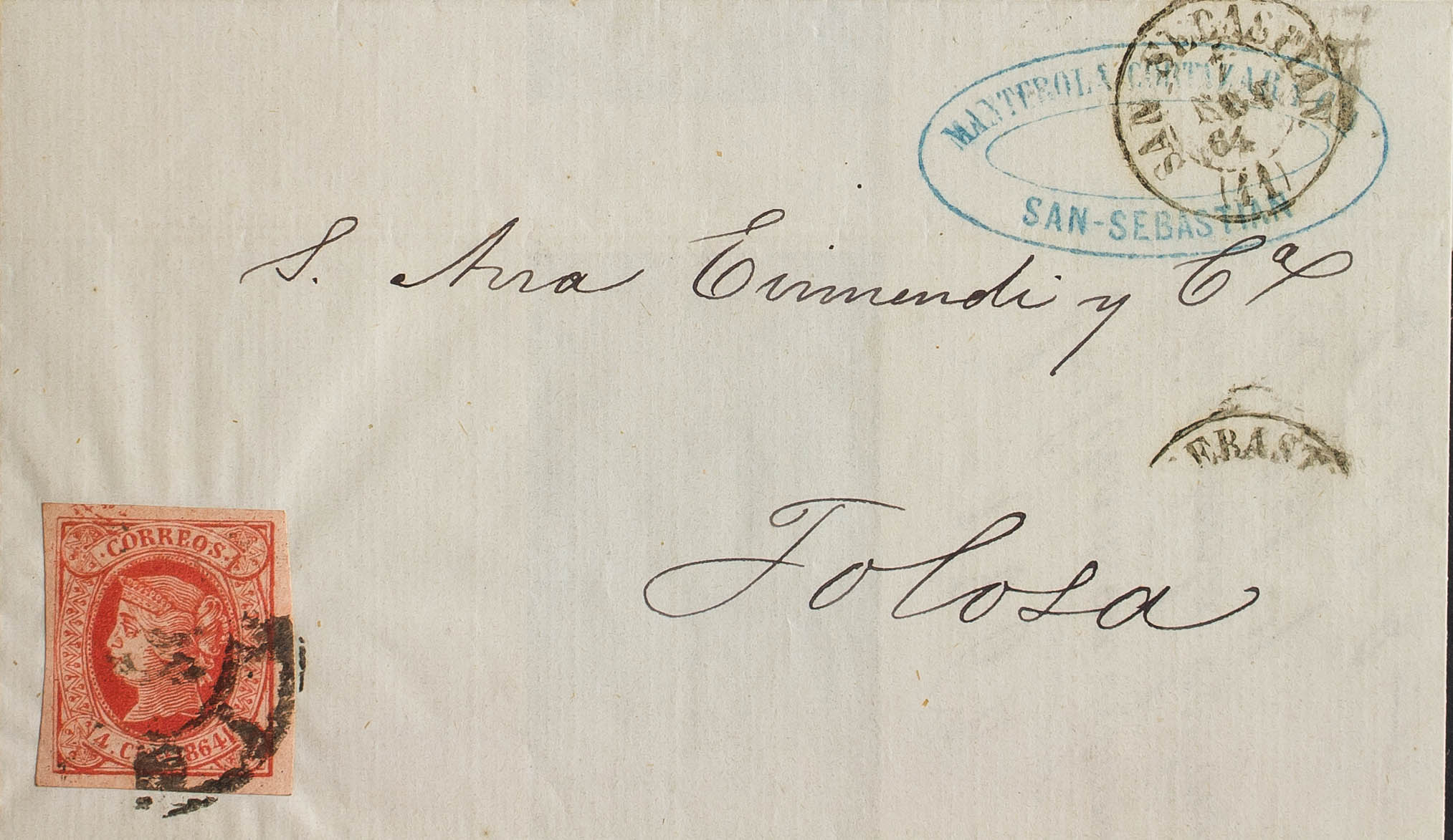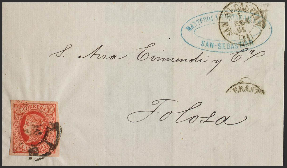 64F. 1864. 4 cuartos rojo FALSO POSTAL TIPO UNICO. SAN SEBASTIAN a TOLOSA. MAGNIFICA Y RARISIMO USADO EN SAN SEBASTIAN.