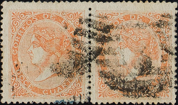 89F(2). 1867. 12 cuartos naranja FALSO POSTAL TIPO UNICO, en pareja. MAGNIFICA Y RARA.