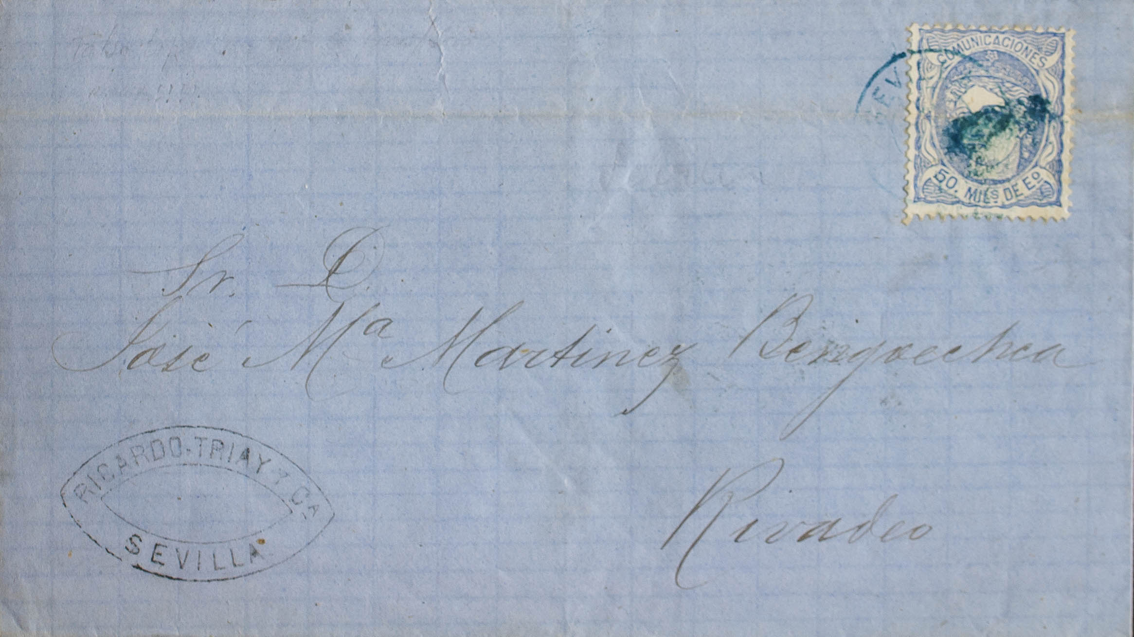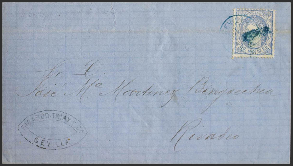 107F. 1872. 50 mils ultramar FALSO POSTAL TIPO IX. SEVILLA a RIVADEO. MAGNIFICA E INUSUAL.