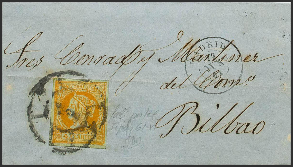 52F. 1861. 4 cuartos amarillo FALSO POSTAL TIPO XI. Frontal de MADRID a BILBAO. MAGNIFICO Y MUY RARO.