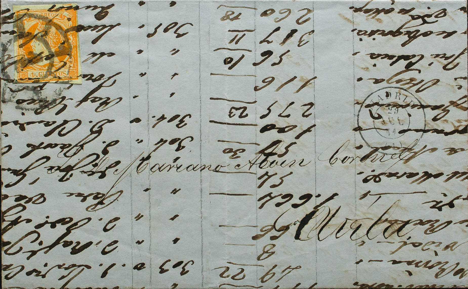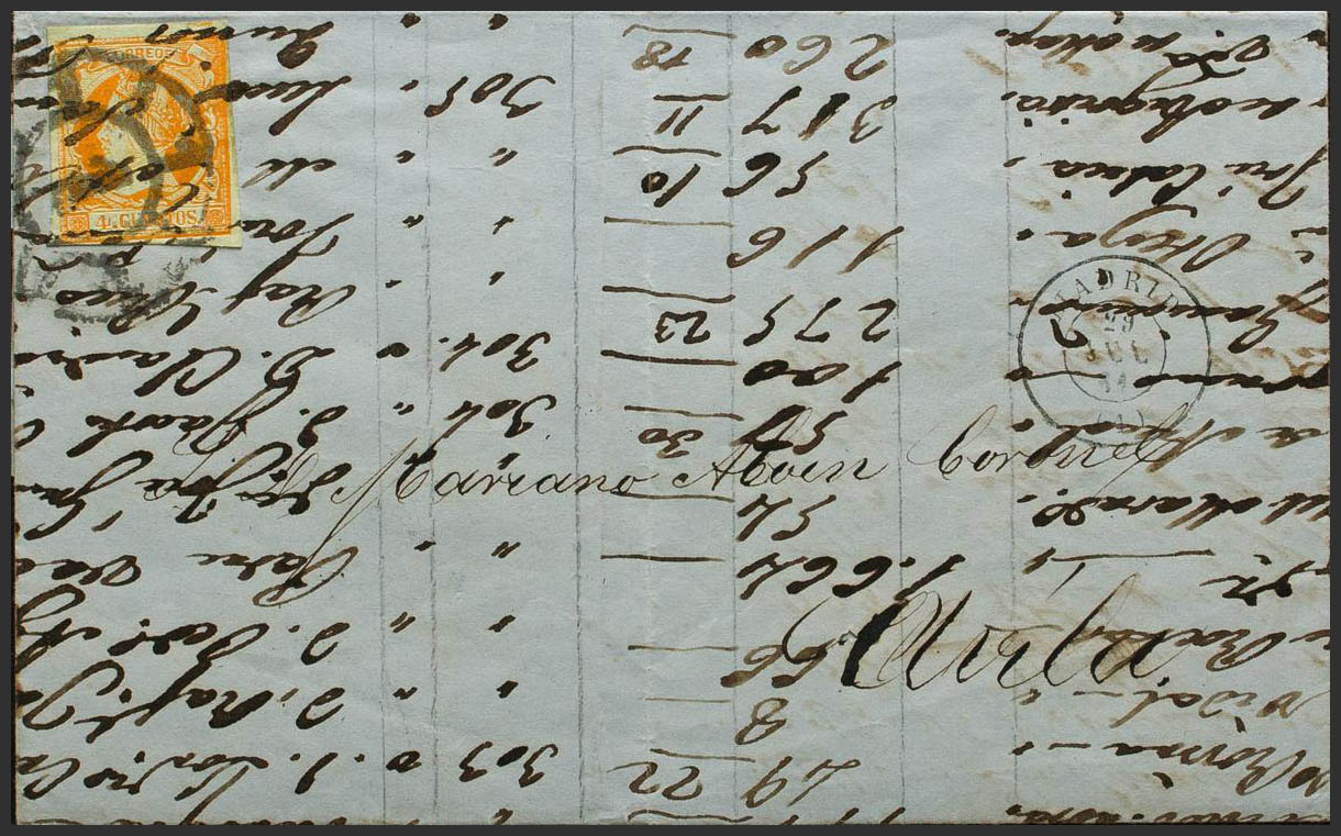 52F. 1861. 4 cuartos naranja FALSO POSTAL TIPO XIII. MADRID a AVILA. MAGNIFICA.