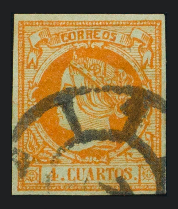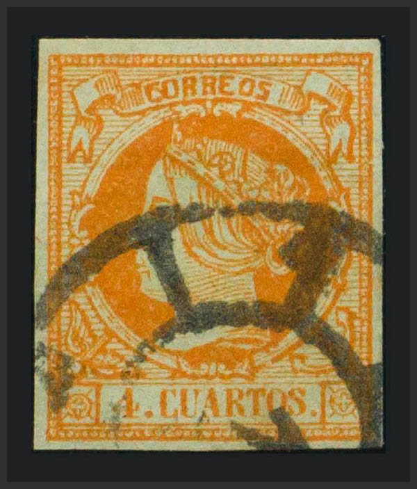 52F. 1860. 4 cuartos naranja. FALSO POSTAL TIPO VI. MAGNIFICO Y RARO.