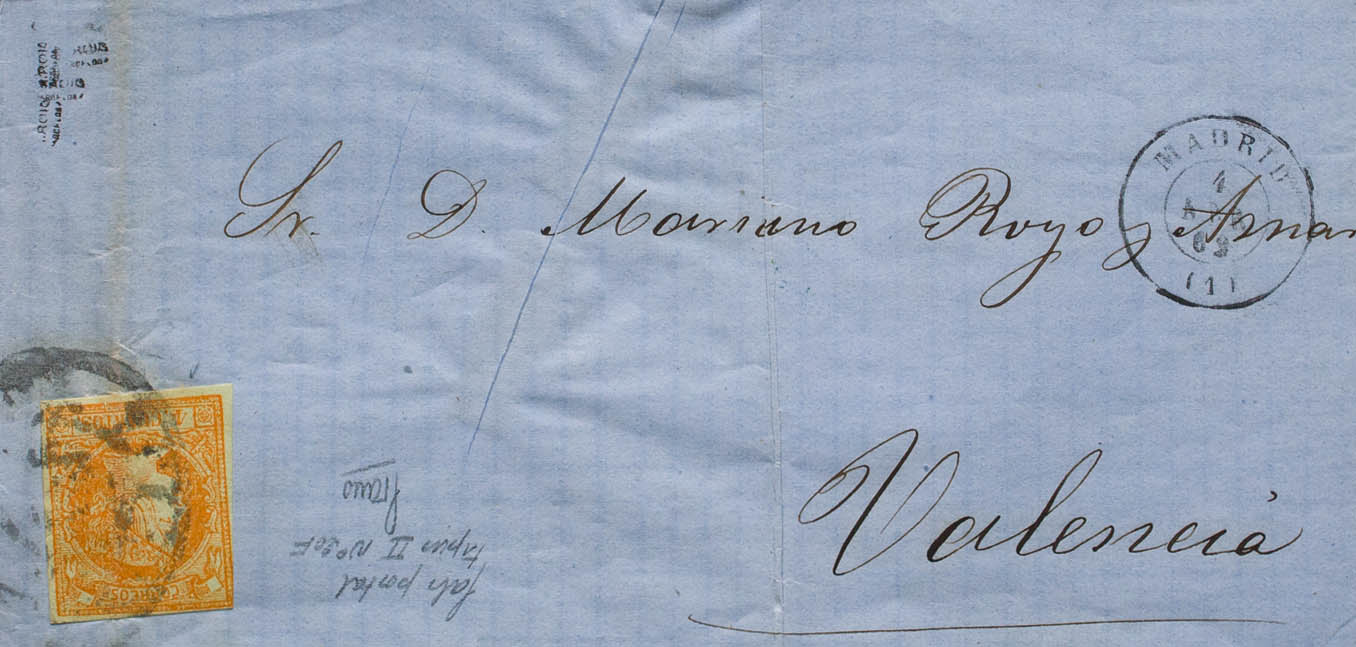 52F. 1862. 4 cuartos naranja FALSO POSTAL TIPO II. MADRID a VALENCIA. MAGNIFICA.