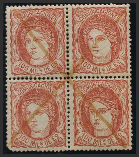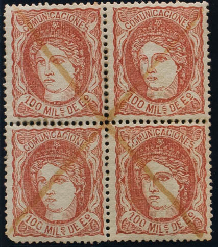 108F(4). 1870. 100 mils castaño rojo FALSO POSTAL TIPO II, bloque de cuatro. Inutilizado a pluma. MAGNIFICO Y MUY RARO BLOQUE.