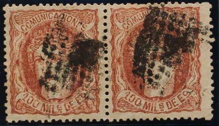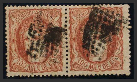 108F(2). 1870. 100 mils castaño rojo FALSO POSTAL TIPO II, en pareja. MAGNIFICA E INUSUAL.