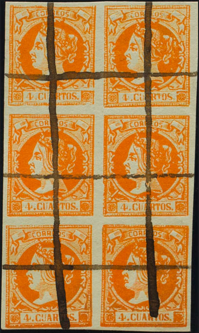 52F(6). 1860. 4 cuartos naranja FALSO POSTAL TIPO XIII, bloque de seis. Inutilizado a pluma. MAGNIFICO.