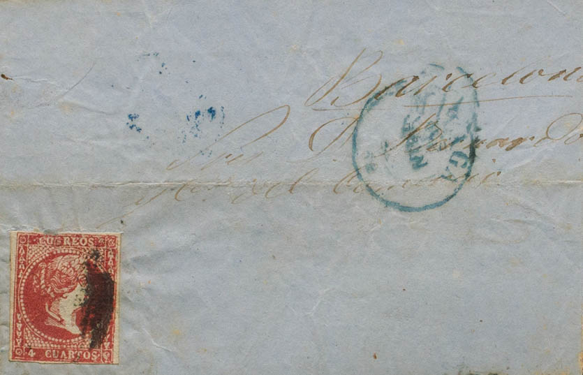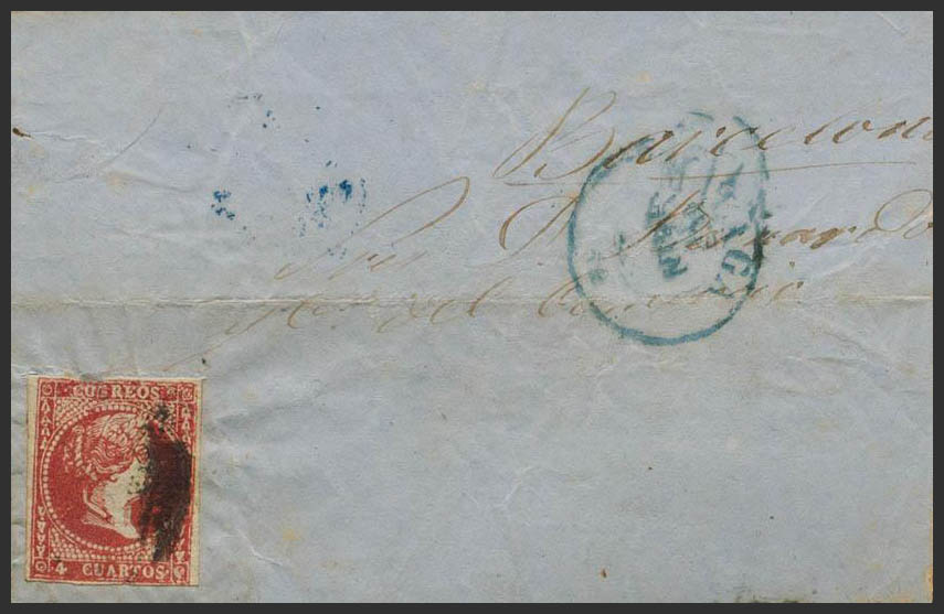 Falso Postal. 4 cuartos rojo FALSO POSTAL TIPO I (Graus 52-I), sobre fragmento de carta con origen en Málaga.