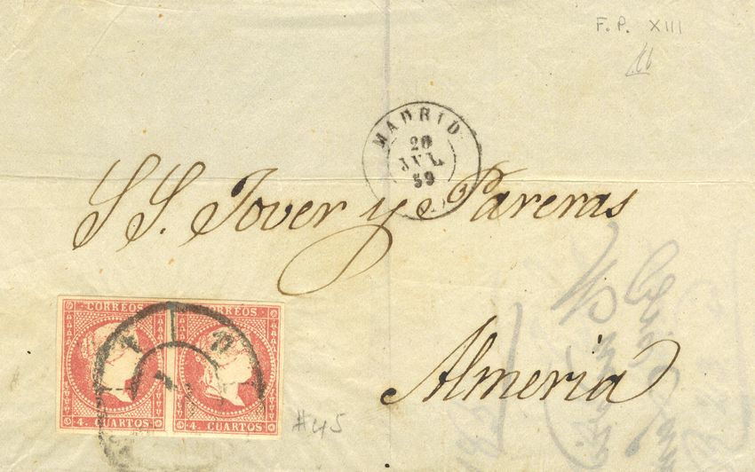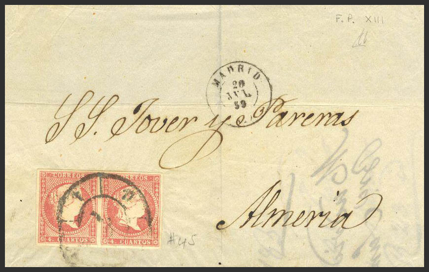 48F(2). 1859. 4 cuartos rojo, pareja. MADRID a ALMERIA. FALSO POSTAL TIPO XIII. MAGNIFICA Y RARISIMA PAREJA FALSO POSTAL EN CARTA.