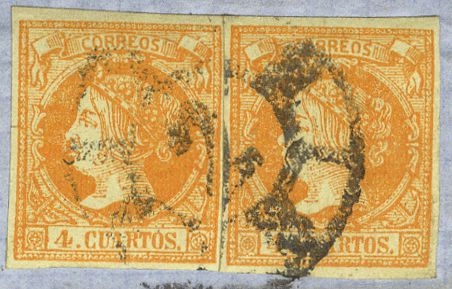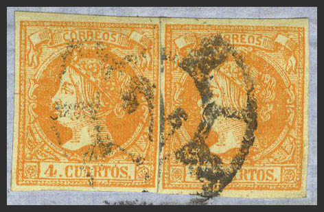 △ 52F(2). 1860. 4 cuartos amarillo, dos sellos, sobre fragmento. FALSO POSTAL TIPO II. MAGNIFICO Y RARO.