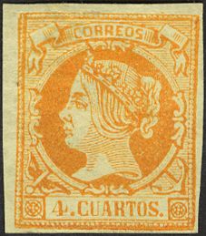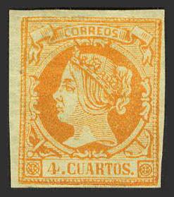 ★ 52F. 1860. 4 cuartos naranja. FALSO POSTAL TIPO XIII. MAGNIFICO.