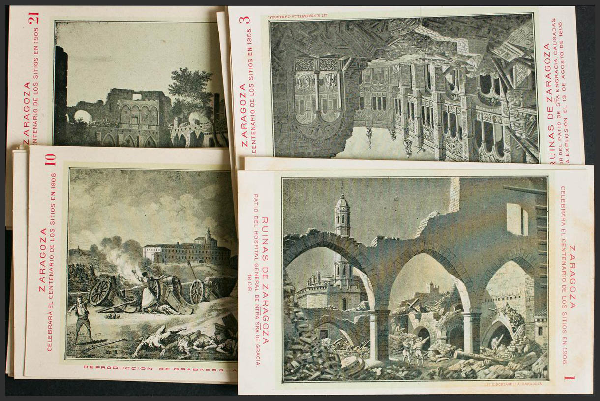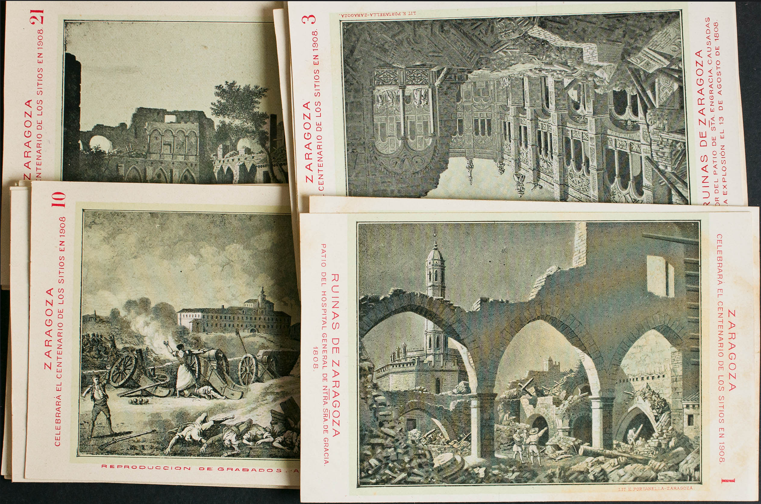(★)1908. Juego completo de las veinticuatro Tarjetas Postales de los SITIOS DE ZARAGOZA, al dorso firmadas por diversas autoridades y con la marca CORREOS / ZARAGOZA / 1º CONGRESO / FILATELICO ESPAÑOL, en violeta. MAGNIFICO Y MUY RARO CONJUNTO.