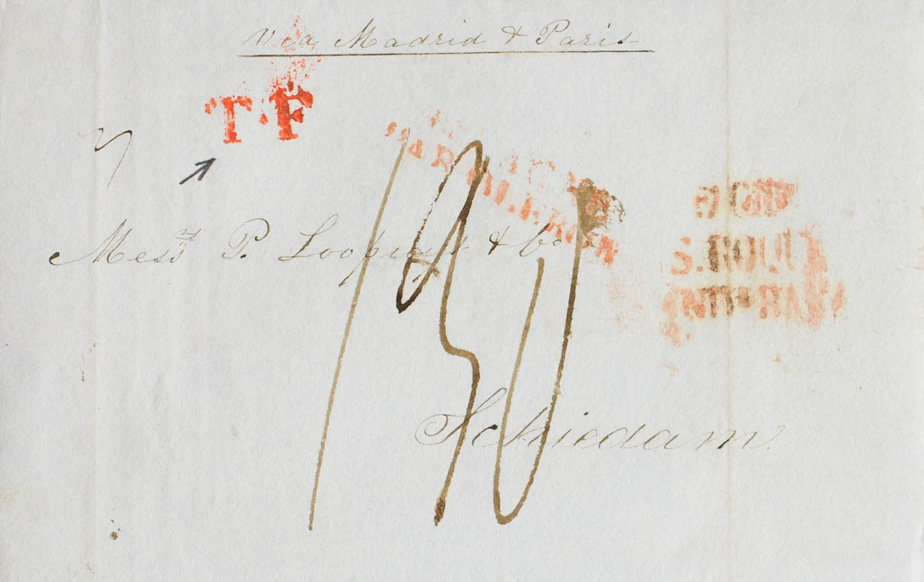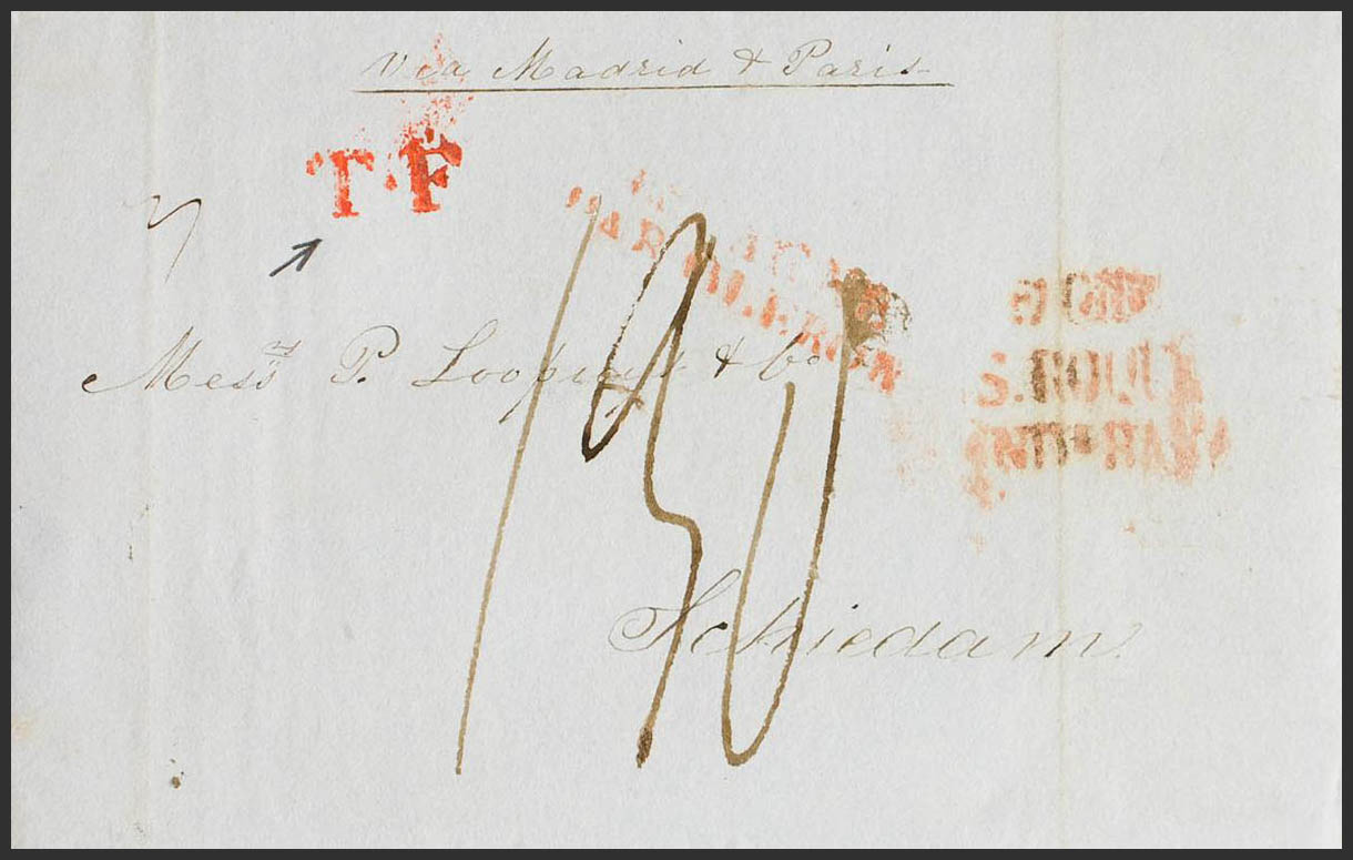 1837. GIBRALTAR a SCHIEDAM (HOLANDA). Marca DE GIB. / S. ROQUE / ANDª. BAXA, en rojo (P.E.10) edición 2004. MAGNIFICA Y RARA.