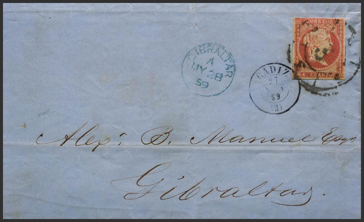 48. 1858. 4 cuartos rojo. CADIZ a GIBRALTAR. Matasello R.CARRETA Nº3, en el frente fechador GIBRALTAR, en azul. MAGNIFICA Y RARISIMO DESTINO, SON MUY ESCASAS LAS CARTAS DIRIGIDAS A GIBRALTAR.