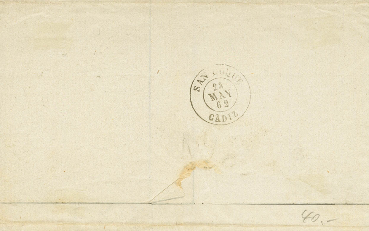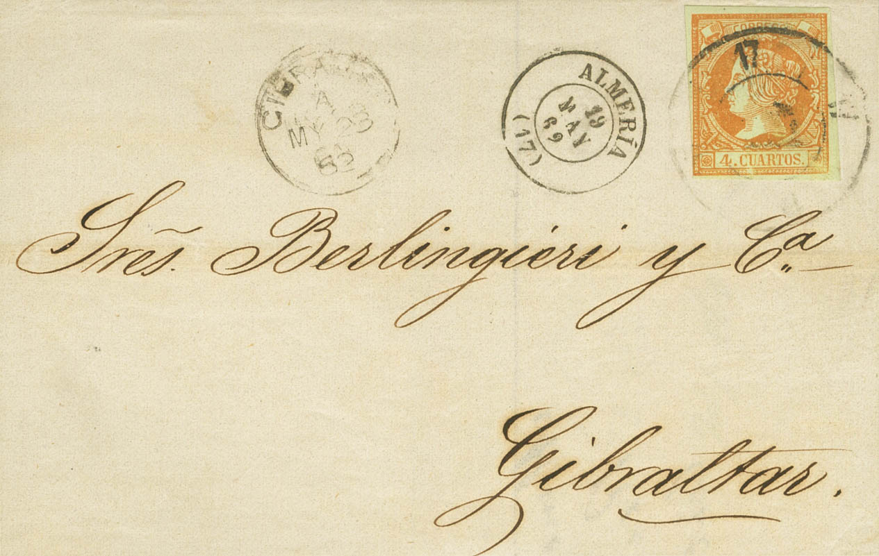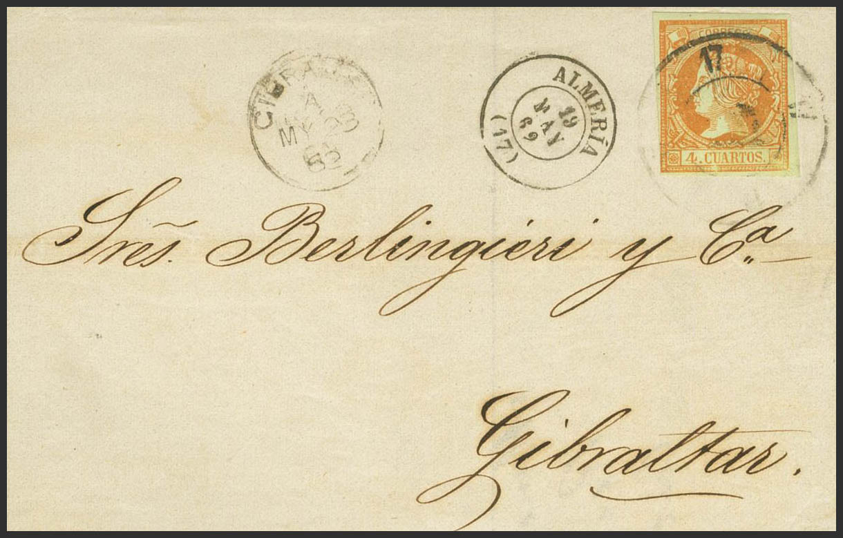 52. 1862. 4 cuartos naranja. ALMERIA a GIBRALTAR. Matasello R.CARRETA Nº17 y en el frente fechador de llegada a Gibraltar. MAGNIFICA Y RARISIMA CON DESTINO A GIBRALTAR.