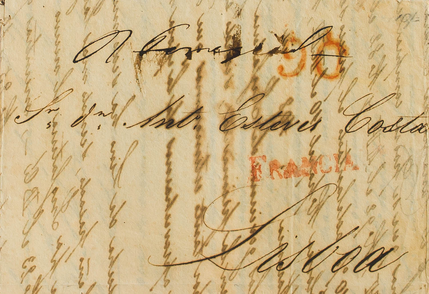 (1820ca). RIGA (LETONIA) a LISBOA. Marca FRANCIA, de Irún aplicada en tránsito para indicar el origen de la misiva, aunque en este caso la procedencia es otra (error relativamente frecuente, y que en este caso además estaba justificado, ya que no tenían la marca de Letonia) (P.E.22) edición 2004. MAGNIFICA Y MUY RARO ORIGEN Y DESTINO EN UNA CARTA TRANSITADA POR ESPAÑA.