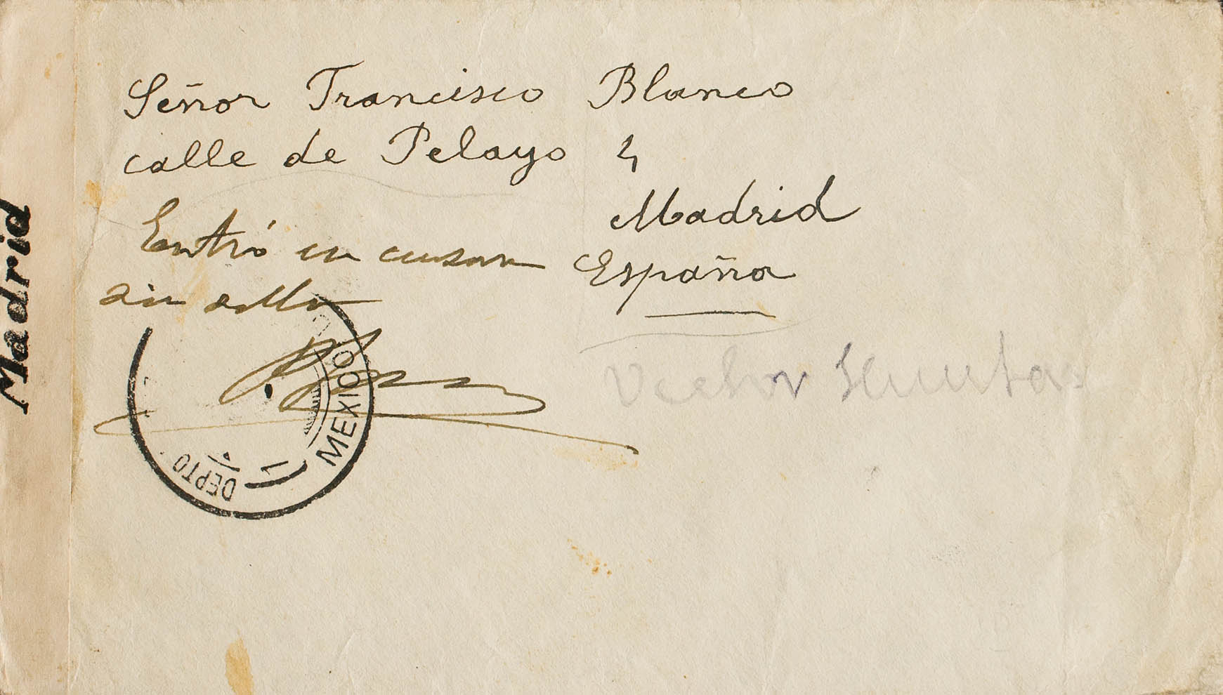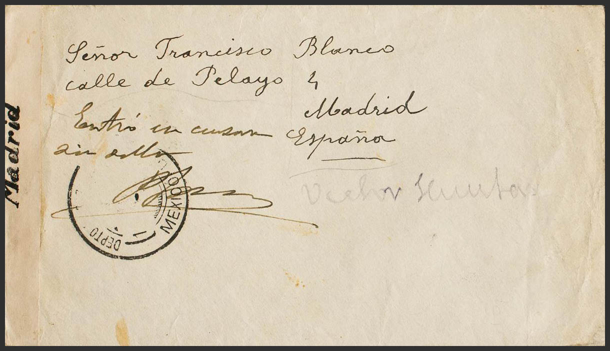 1940. MEXICO a MADRID. Originalmente franqueada y correctamente anulada (en el transporte de la correspondencia el sello se desprende), el censor aplica la banda de censura e indica de forma manuscrita "Entró en censura sin sello" sobre el espacio de que ocupaba el mismo. MAGNIFICA Y RARA.