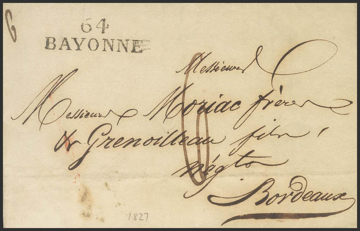 1827. (19 de Julio). BAYONA a BURDEOS (FRANCIA), Ejército de los "Cien mil hijos de San Luis". Marca 64 / BAYONNE, al dorso marca del Servicio Militar, estampada en Bayona, base del Ejército Expedicionario en Francia, con la Corona y el escudo de armas característicos de esta marca, TRANSPORTES DE LA GUERRE / 11 ME DIVISION-ARIAS PERVIETTI CIE. MAGNIFICA Y RARISIMA, SIN CATALOGAR.
